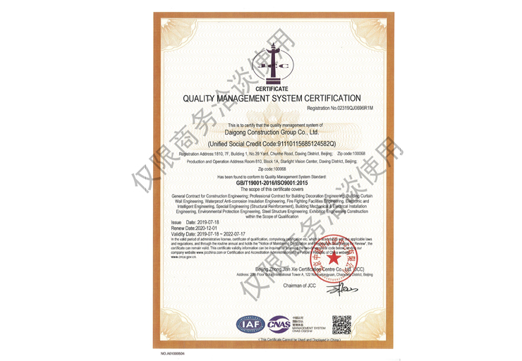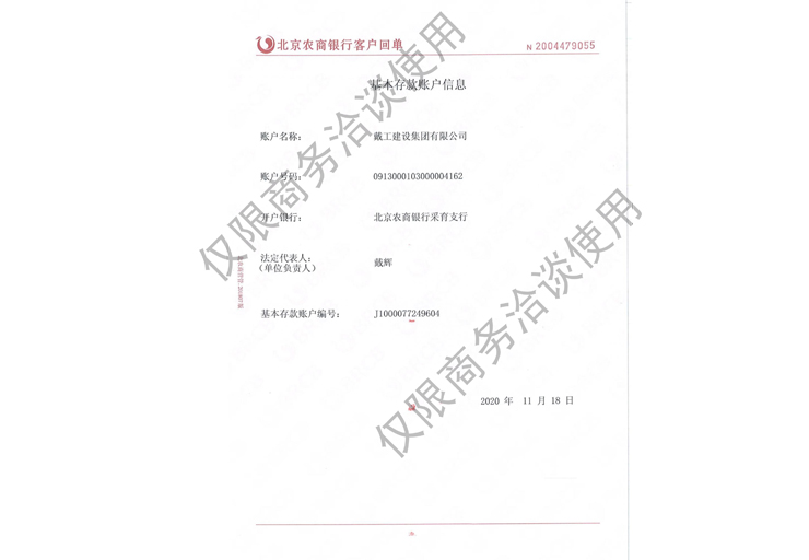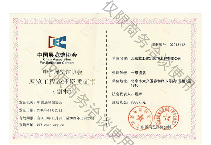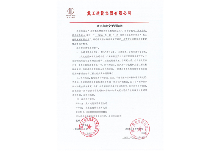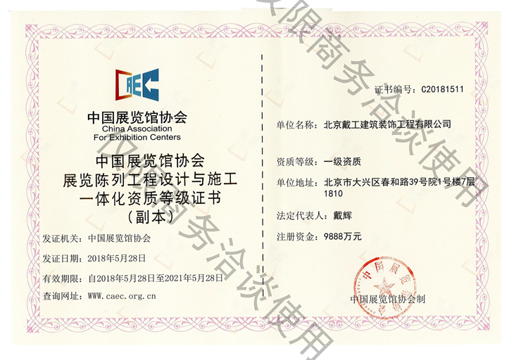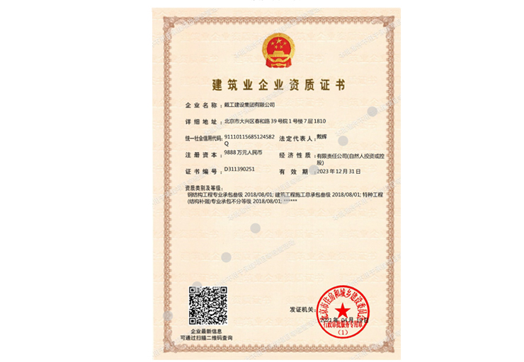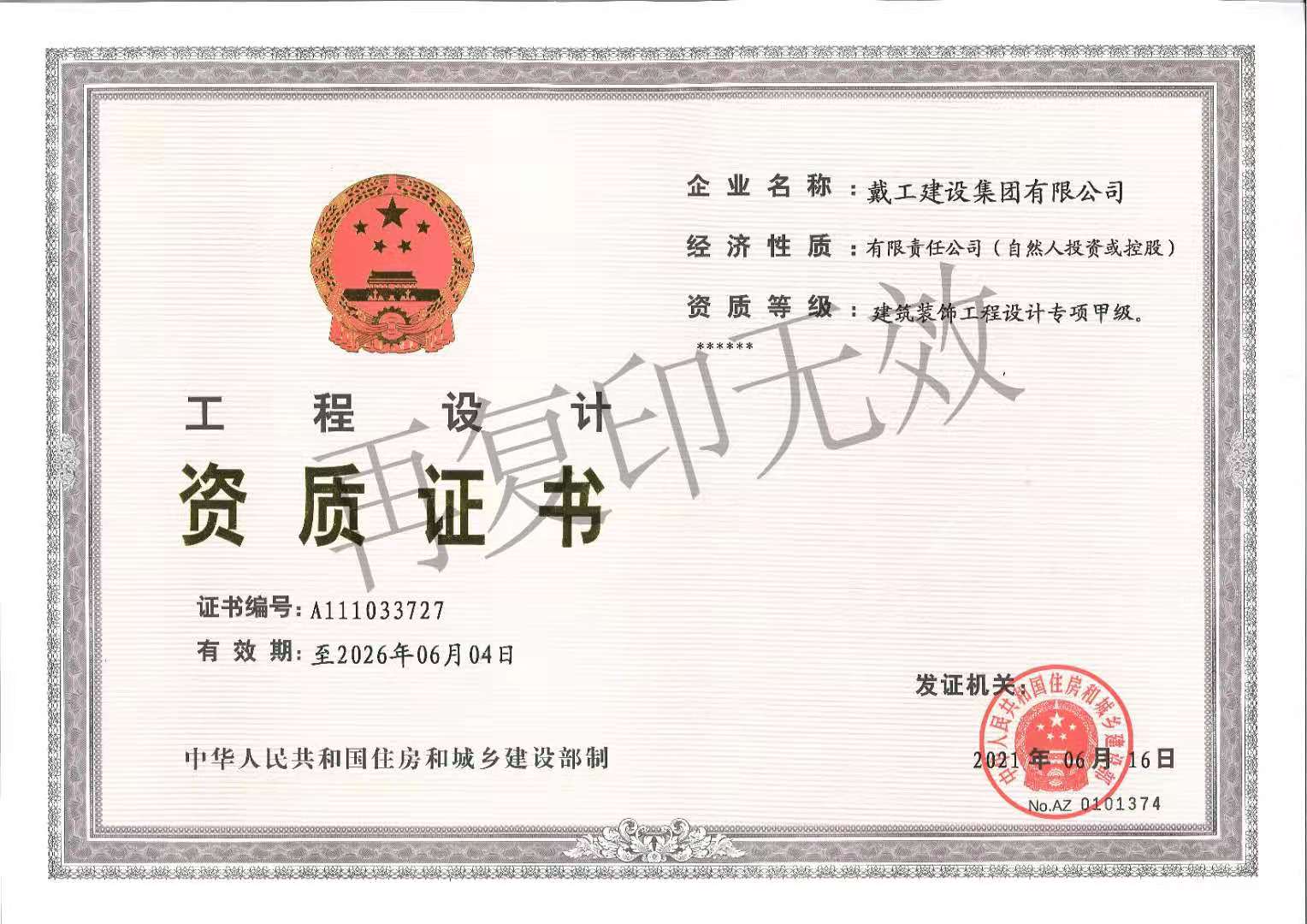 戴工建設(shè)集團(tuán)有限公司,創(chuàng)建于2009年,注冊(cè)資本9888萬(wàn)元人民幣。公司位于北京市大興區(qū)。具有建委頒發(fā)的建筑裝飾裝修專業(yè)壹級(jí),防水保溫工程專業(yè)壹級(jí),建筑幕墻專業(yè)貳級(jí),消防設(shè)施專業(yè)貳級(jí),電子與智能化專業(yè)貳級(jí),特種工程(結(jié)構(gòu)補(bǔ)強(qiáng))專業(yè)不分等級(jí),建筑機(jī)電安裝專業(yè)貳級(jí),環(huán)保工程專業(yè)貳級(jí),鋼結(jié)構(gòu)專業(yè)貳級(jí),建筑工程總承包貳級(jí),建筑裝飾工程設(shè)計(jì)專項(xiàng)甲級(jí),展覽陳列工程設(shè)計(jì)與施工壹級(jí),展覽展示工程壹級(jí)...更多>>